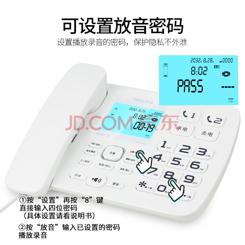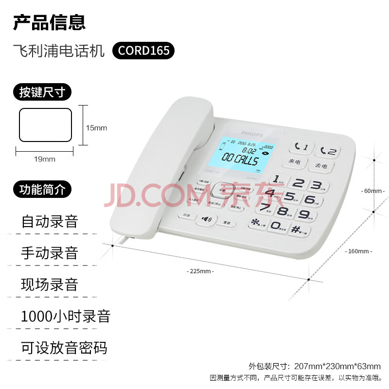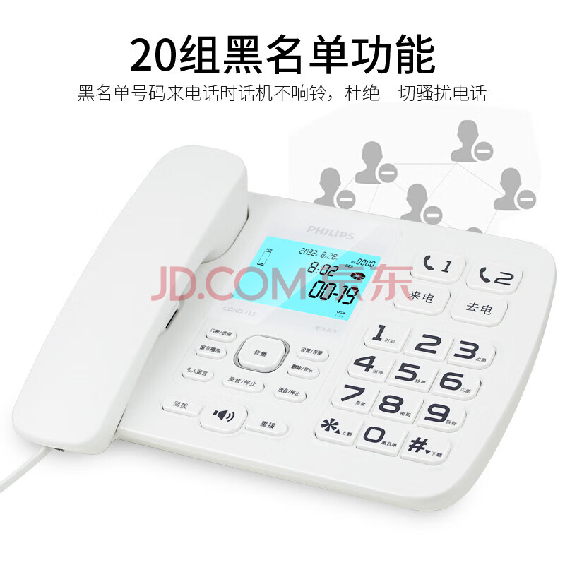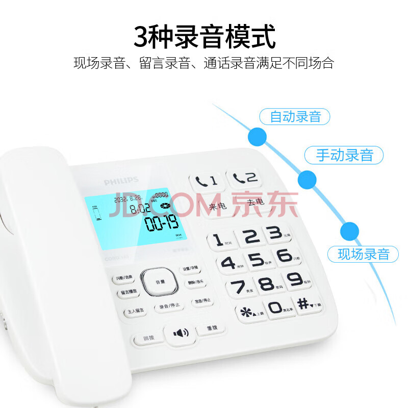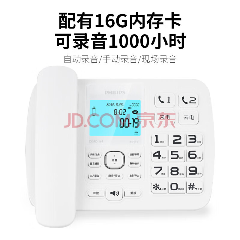 商品相册:飞利浦(PHILIPS)录音电话机 固定座机 办公家用 自动 手动录音 16G存储卡 放音密码保护 CORD165 (白色)第