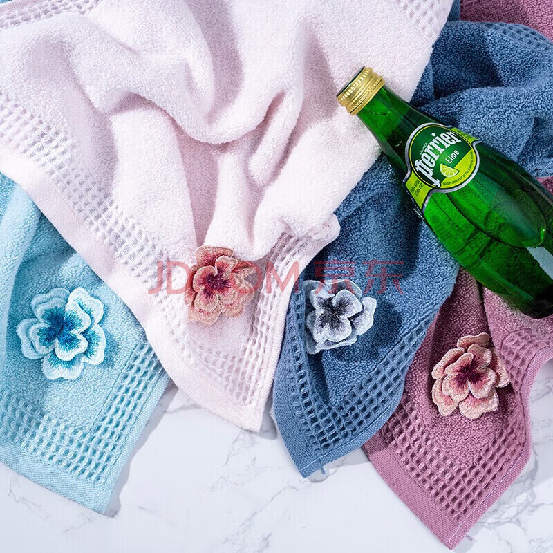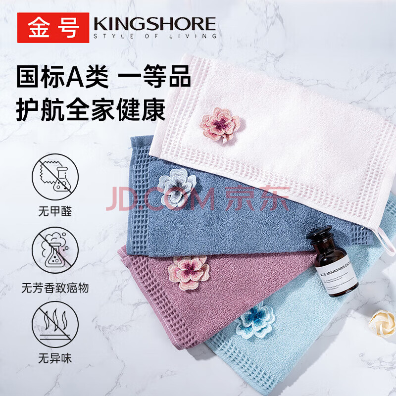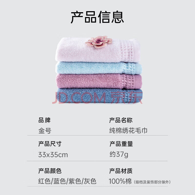 商品相册:金号毛巾 3A抗菌纯棉擦手巾挂式毛巾大方巾4条 挂绳抹手巾红/蓝/紫/灰第