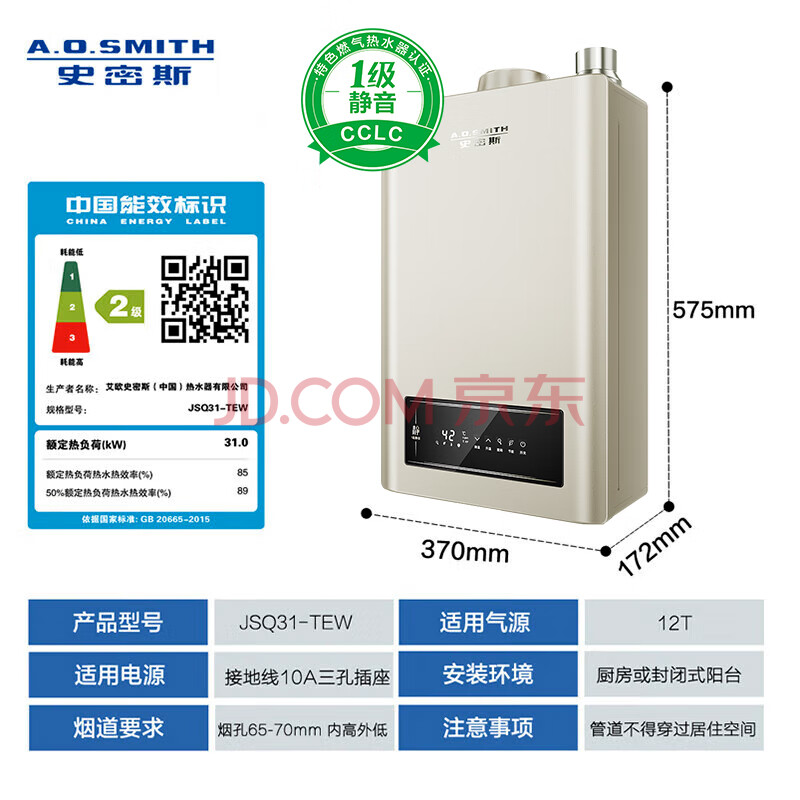 商品相册:史密斯(A.O.SMITH)16升精钢燃气热水器 1级静音 恒温大水量 抗风防冻 JSQ31-TEW 更安全更安静 第