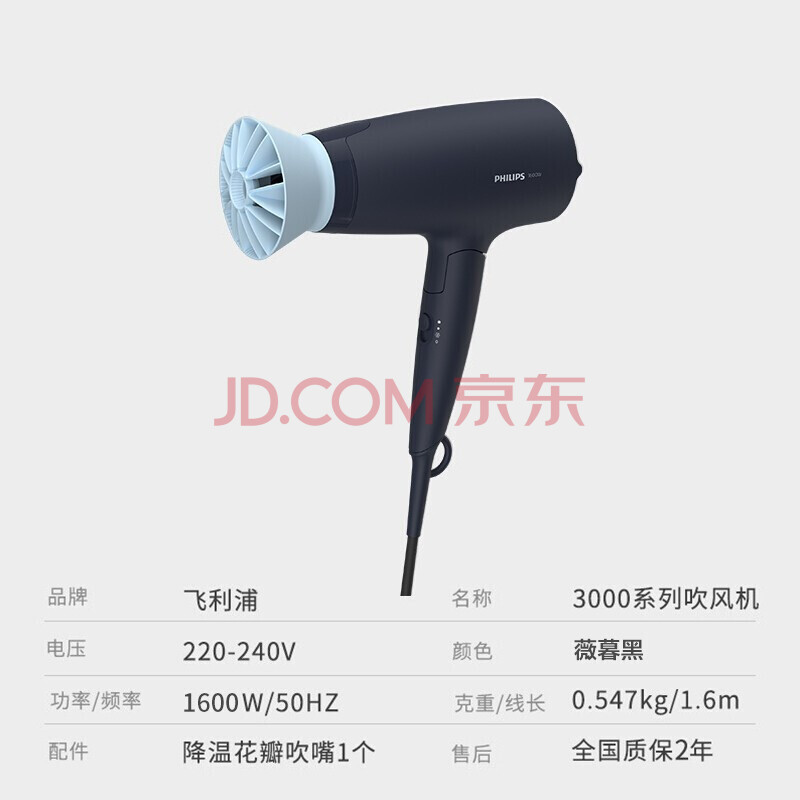 商品相册:飞利浦(PHILIPS)电吹风机 3系小花筒 低温速干大功率 负离子护发黑蓝 可折叠吹风机学生宿舍专用 生日礼物送女友第
