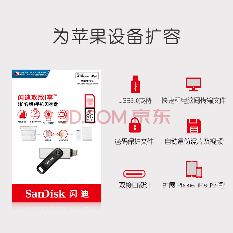 商品相册:闪迪(SanDisk)128GB Lightning USB3.0 苹果U盘 欢欣i享 读速90MB/s 苹果MFI认证 iPhone/iPad手机电脑两用第