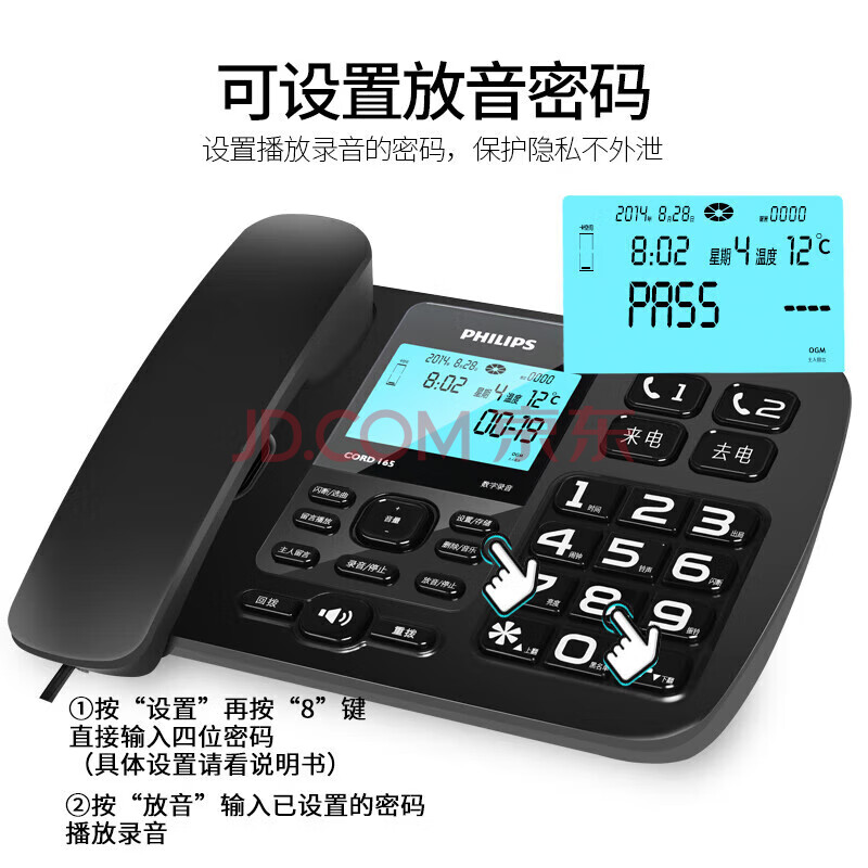 商品相册:飞利浦(PHILIPS)录音电话机 固定座机 办公家用 自动 手动录音 16G存储卡 放音密码保护 CORD165 (黑色)第