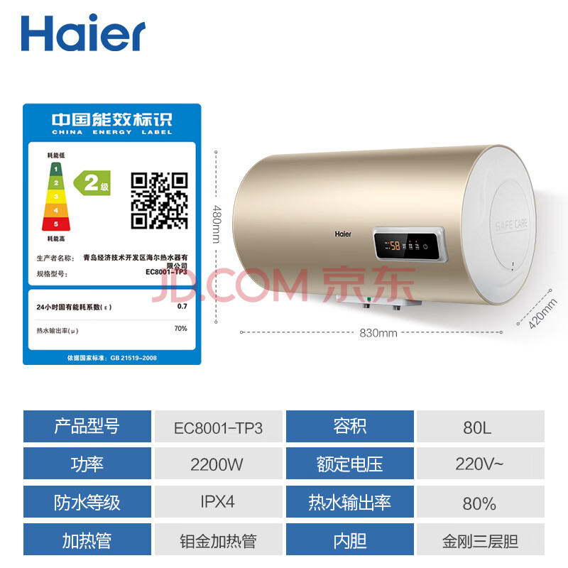 商品相册:海尔(Haier)80升家用电热水器 2200W节能速热内胆不留垢 EC8001-TP3 *第