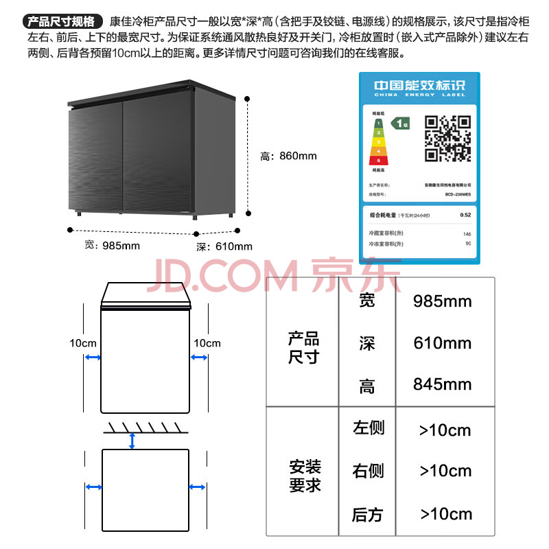 商品相册:康佳(KONKA)236升双温立式对开门 家用冷柜 风冷无霜一级能效冷藏冷冻 BCD-236WES 第