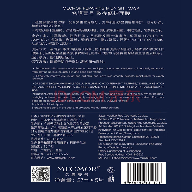 商品相册:名膜壹号(mecmor)熬夜修护面膜补水保湿提亮肤色缓解痘印复活草敏感肌第