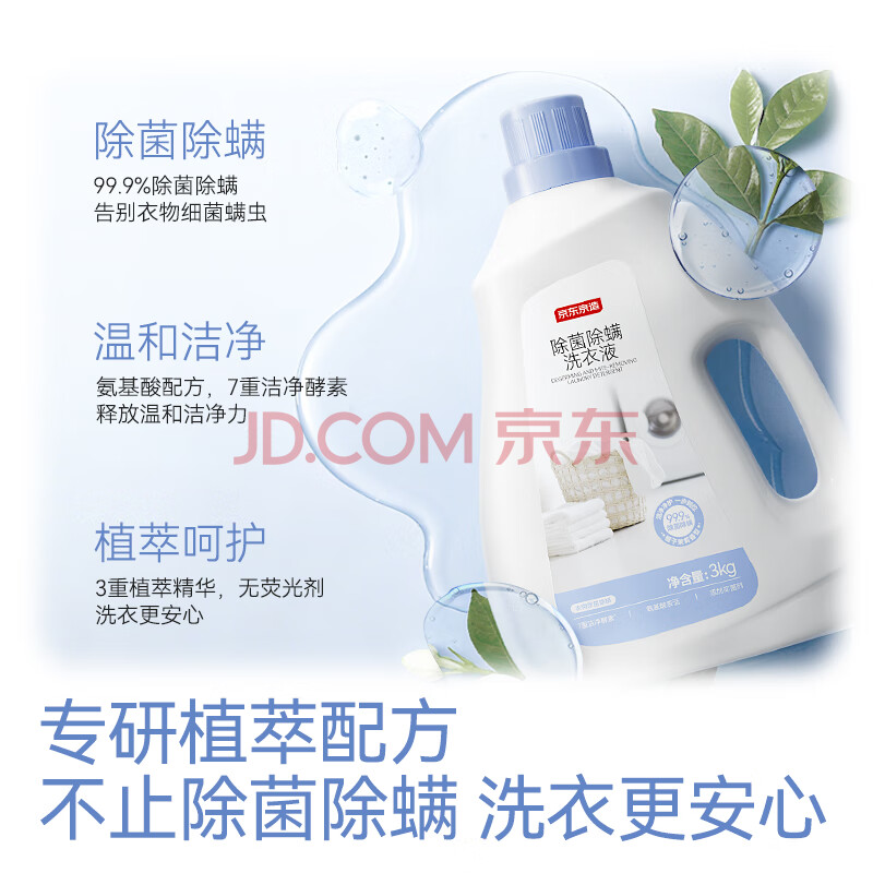 商品相册:京东京造 天然植萃洗衣液20斤(3kg*2瓶+1kg*4袋)除菌除螨99.9% 留香洗衣精第