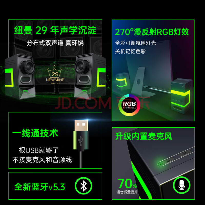 商品相册:纽曼(Newmine)V4 电脑音响音箱 蓝牙5.3台式机笔记本内置麦克风炫彩RGB氛围立体声家用桌面对箱 黑色第