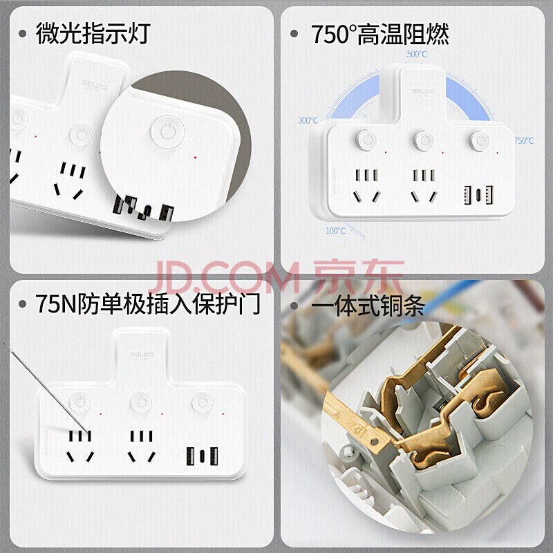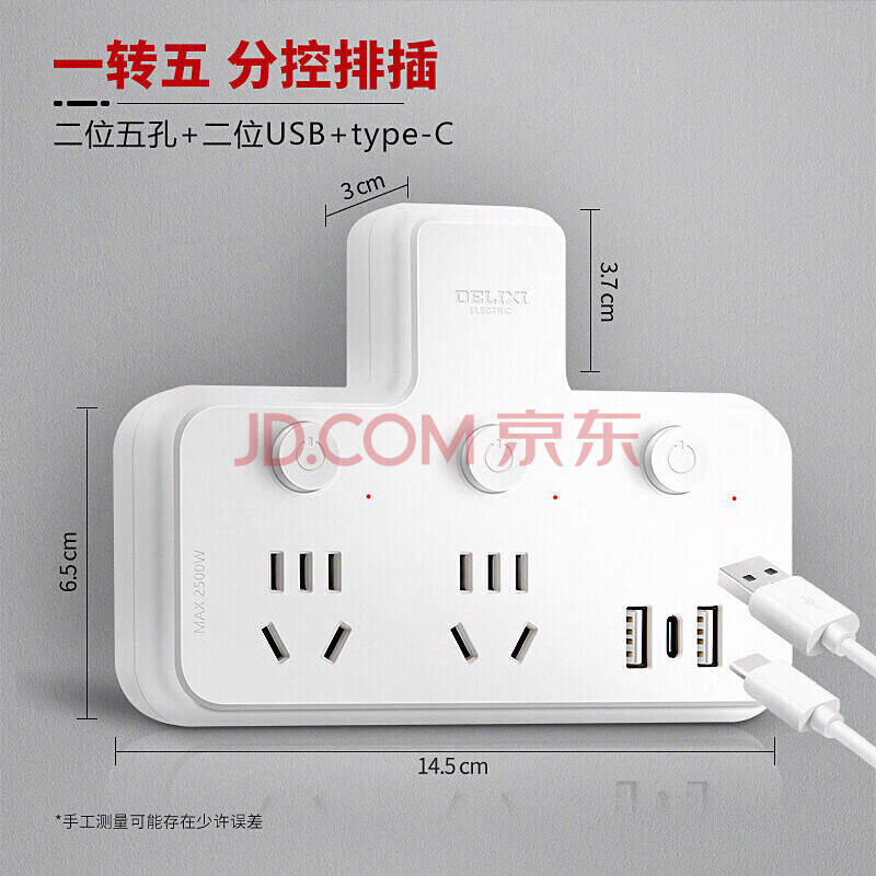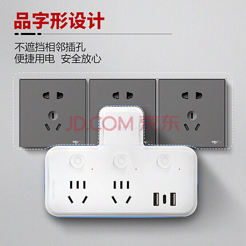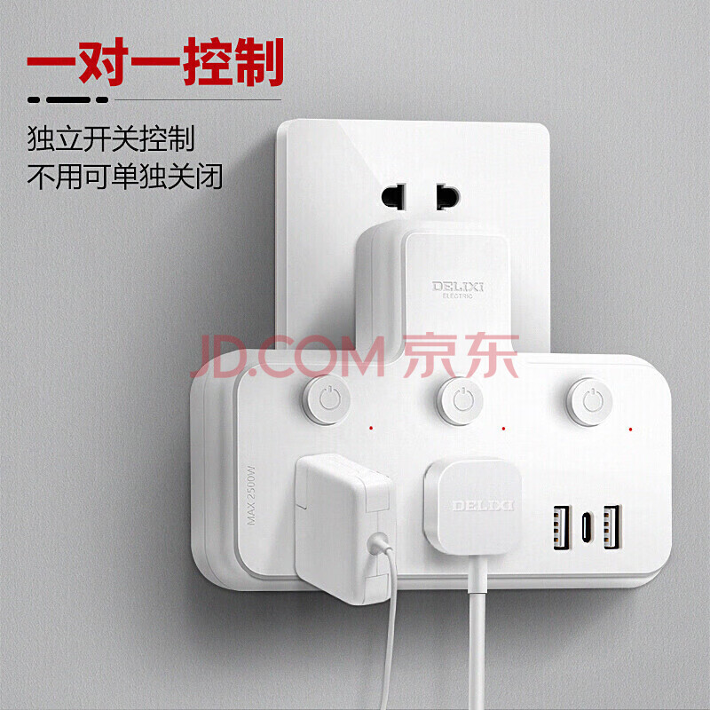 商品相册:德力西(DELIXI)转换插头/品字形一转三插座/无线转换插座/电源转换器/插排/排插 2个usb+TYPE-C 分控开关第