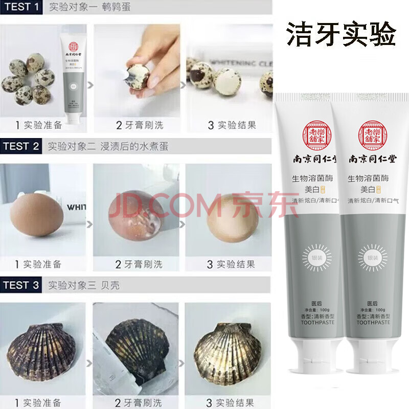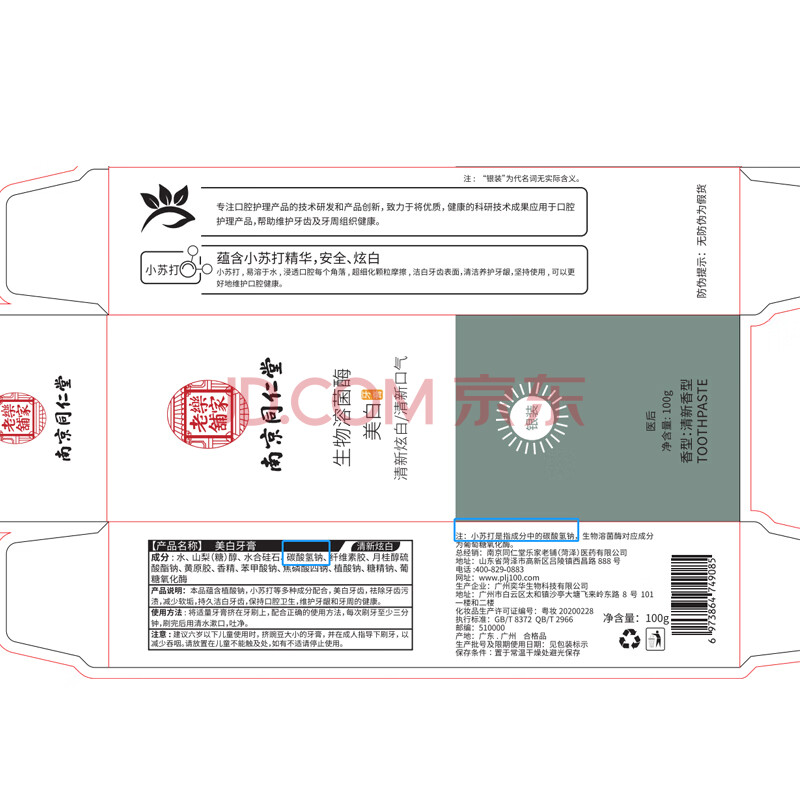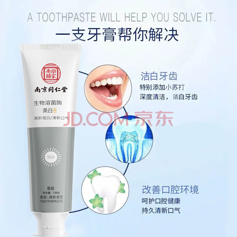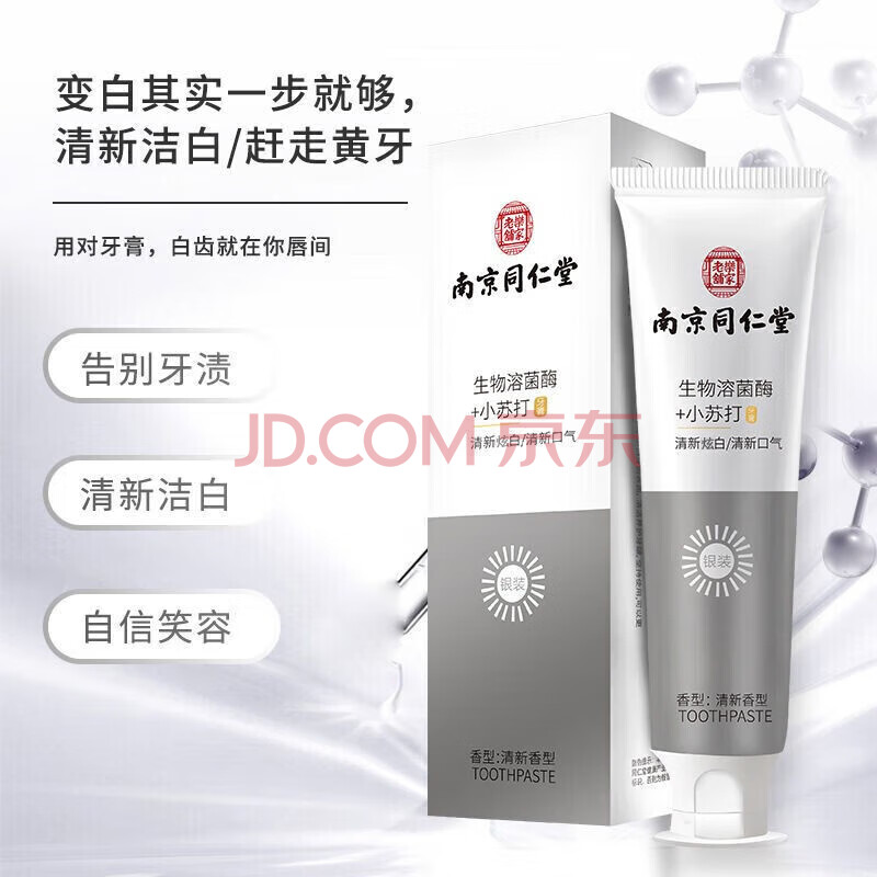 商品相册:南京同仁堂小苏打美白牙膏洁牙去牙渍烟渍亮白牙齿护牙龈清新口气100*1g/盒第