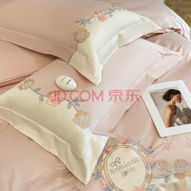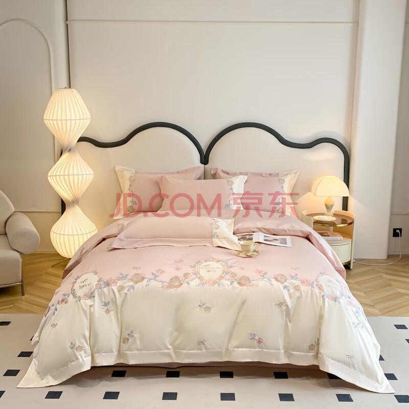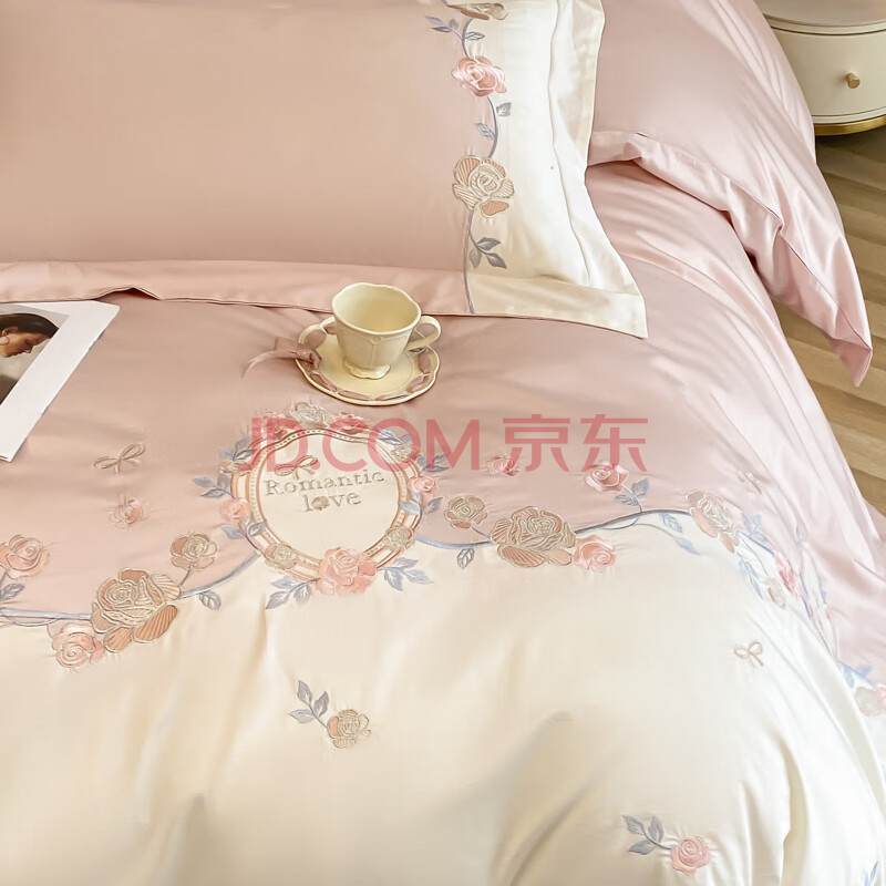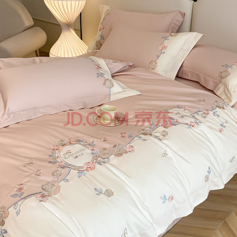商品相册:Demichel 100支刺绣长绒棉四件套纯棉 法式高端全棉床上被套床单 1.8/2米床 莫奈玉粉第