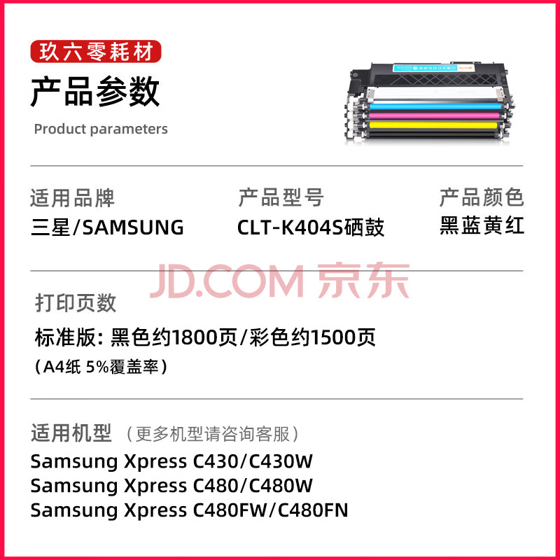 商品相册:玖六零CLT-K404S粉盒适用三星Xpress SL-C430 C430W碳粉盒C480墨盒C480W/FN C480FW彩色打印机硒鼓墨粉盒套装第