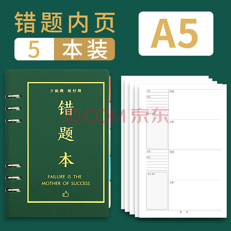 商品相册:法拉蒙 错题本活页可拆卸笔记本子大学生考研加厚纠错本小学初中生数学英语改错作业本A5/1个壳+5本芯/270张第