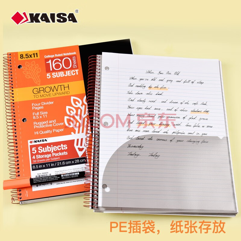商品相册:凯萨(KAISA)A4笔记本升级版五科目160张加厚学生学习考研本子易撕线三孔线圈PP面记事本 第