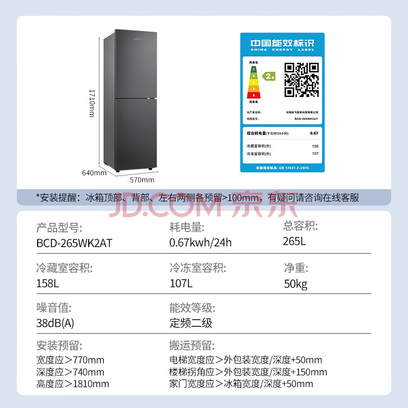 商品相册:新飞(Frestec)265L两门冰箱风冷无霜节能省电低噪大冷冻 BCD-265WK2AT第