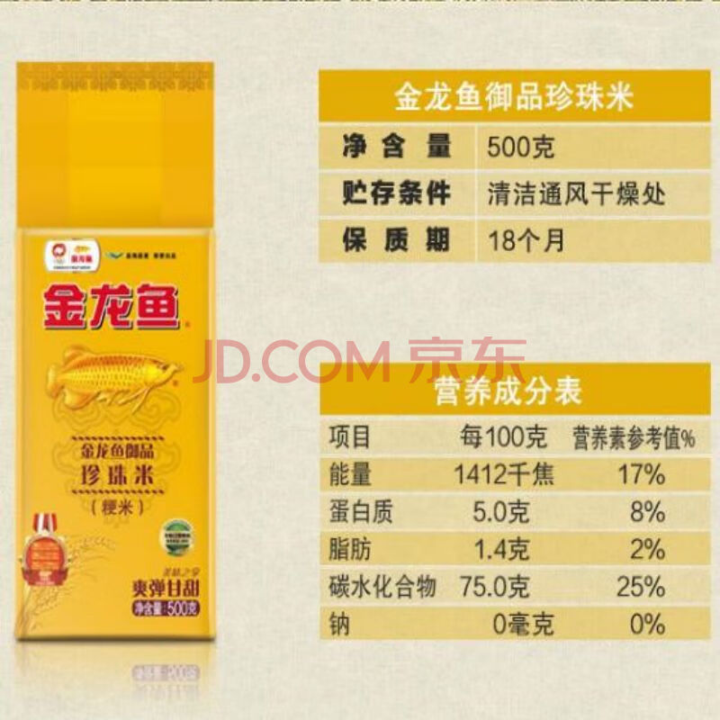 商品相册:金龙鱼 御品珍珠米梗米家庭装小袋米煮粥蒸米饭 500G第1张/共4