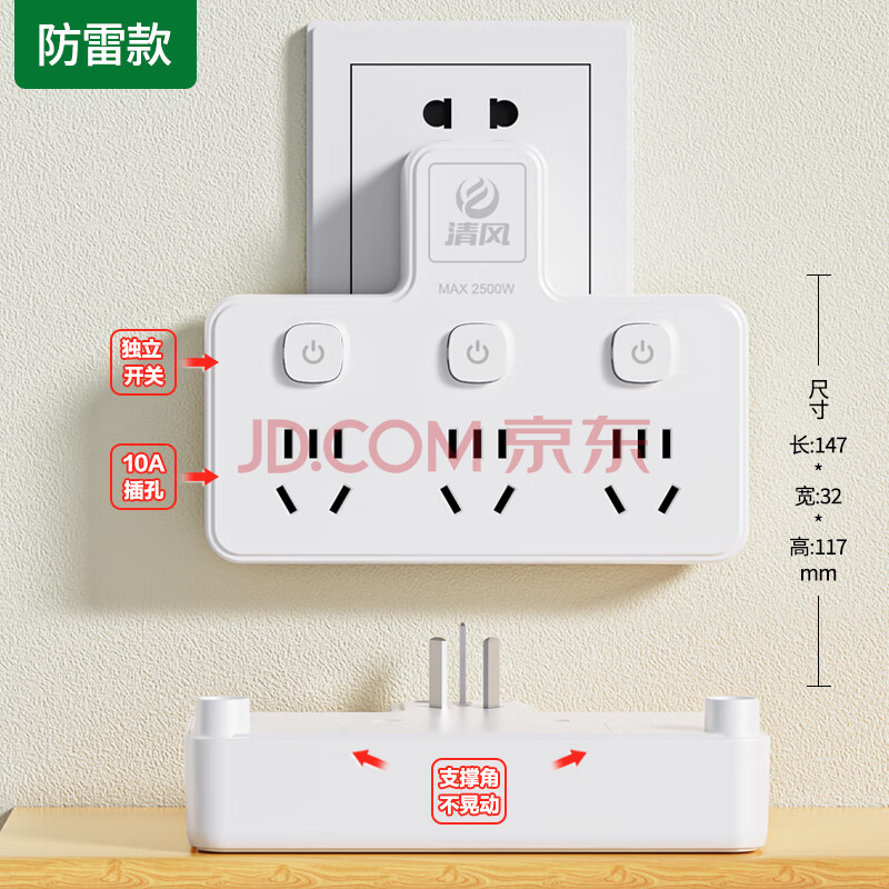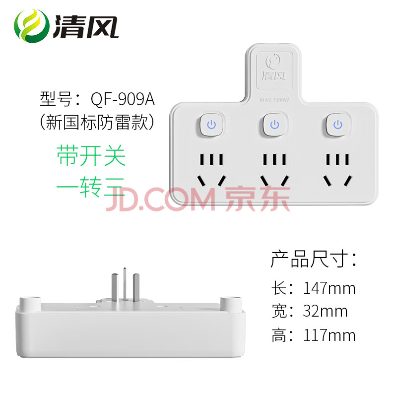 商品相册:清风(kyfen)QF-909A 一转三独立开关带安全保护门电源转换器 新国标 防雷无线白色第