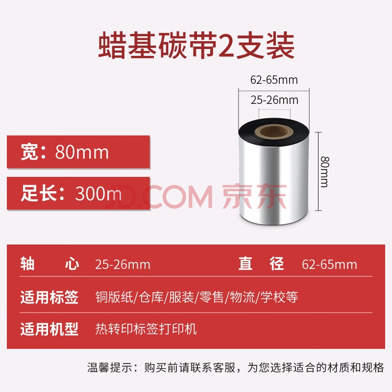 商品相册:得印80mm*300m单轴碳带两支装 蜡基碳带 条码打印机专用色带 标签带 热转印条码机标签打印机通用碳带第