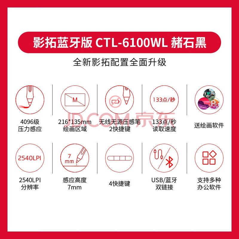 商品相册:Wacom 数位板 手绘板 手写板连电脑手机电子绘画板 蓝牙写字板教学网课CTL-6100WLA/K0-F黑色中号第