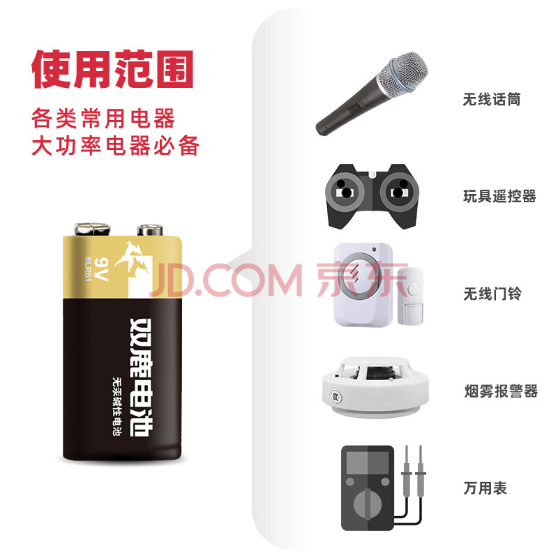 商品相册:双鹿 9V碱性电池10粒卡/盒 适用于仪器仪表/万用表/话筒/麦克风/对讲机/报警器 6LR61/叠层电池第