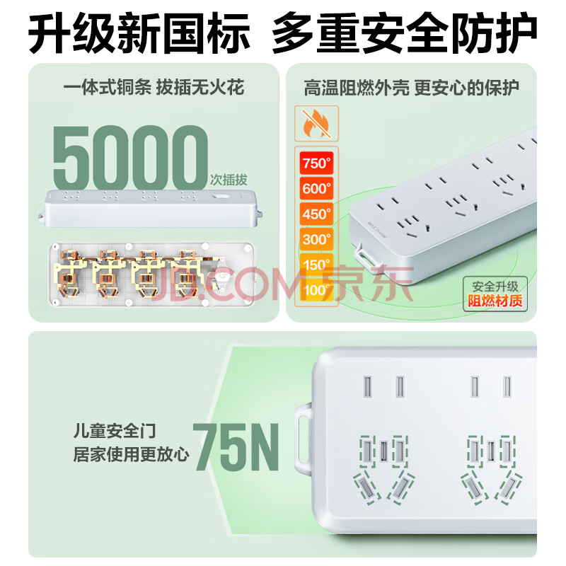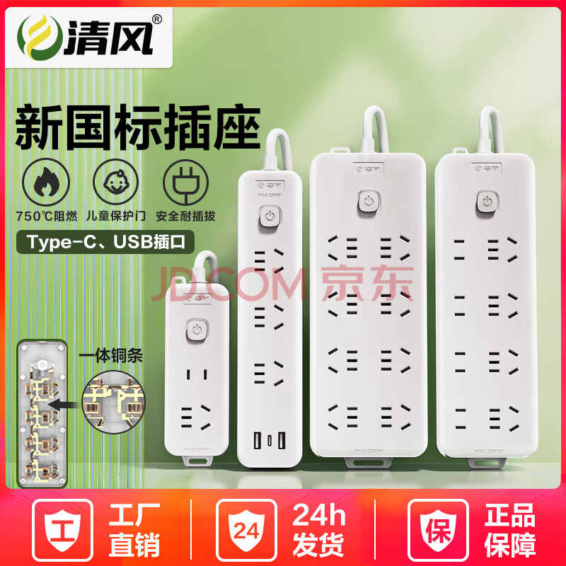商品相册:清风(kyfen)插座/插线板/插排/排插/接线板/拖线板 保护门 总控开关 分控开关 有线插座 三位五孔 全长1.8米第