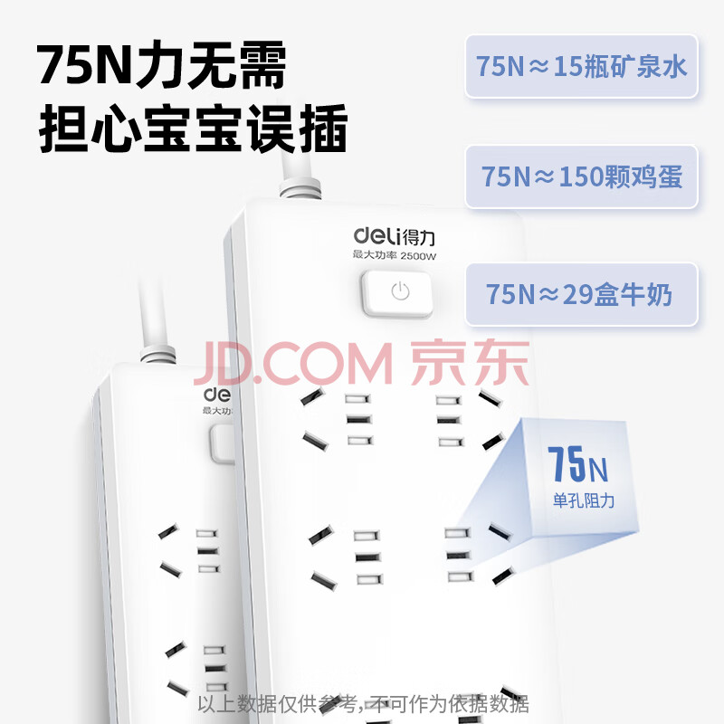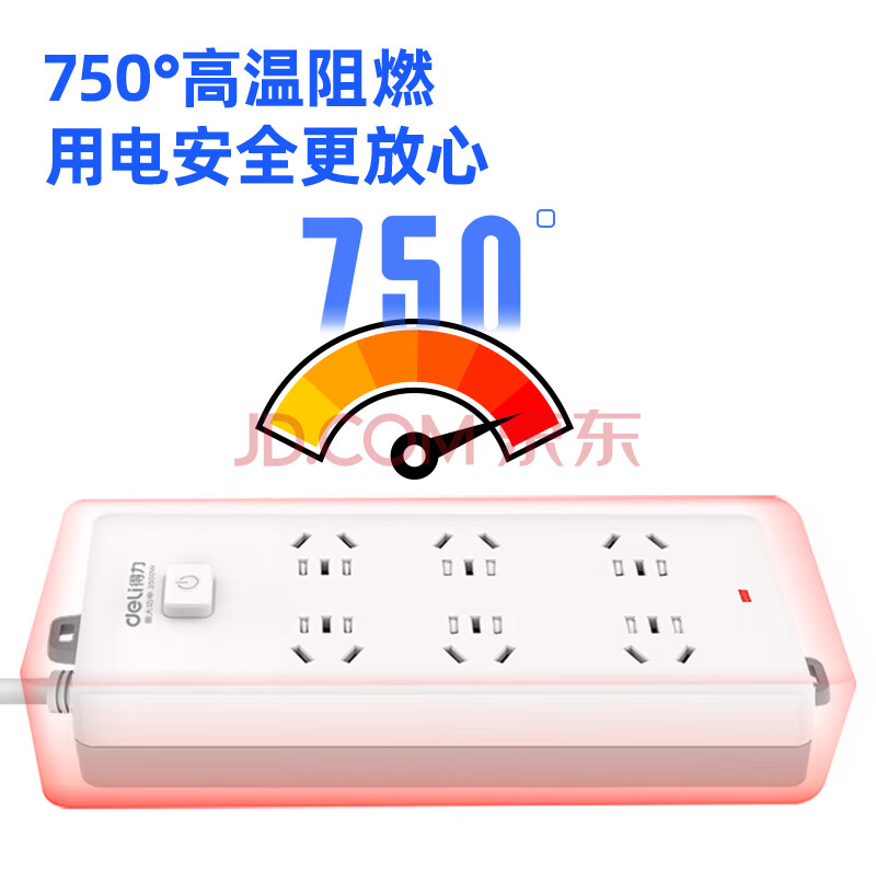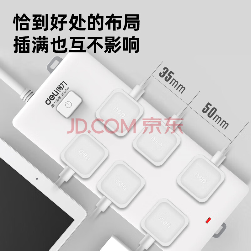 商品相册:得力(deli)3C认证国标安全插座 插排/插线板/接线板/排插/拖线板 50mm大孔距 总控开关 6组合孔3米 18267第