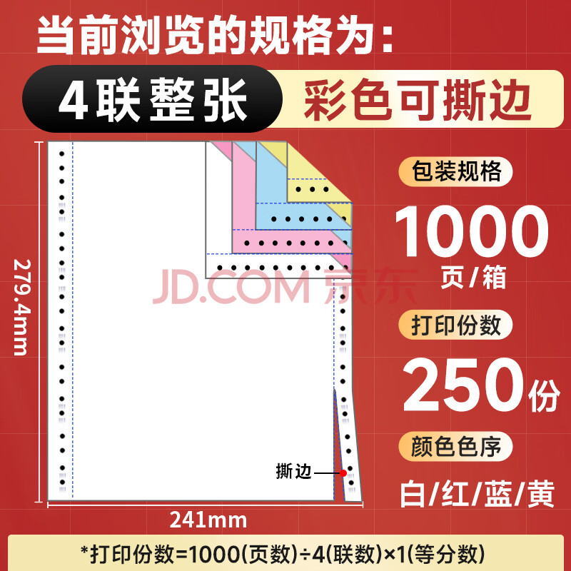 商品相册:天章 (TANGO)【缺页十倍赔】天章风四联整张撕边针式电脑打印纸 出入库送货清单1000页 241-4S(白红蓝黄)可定制第