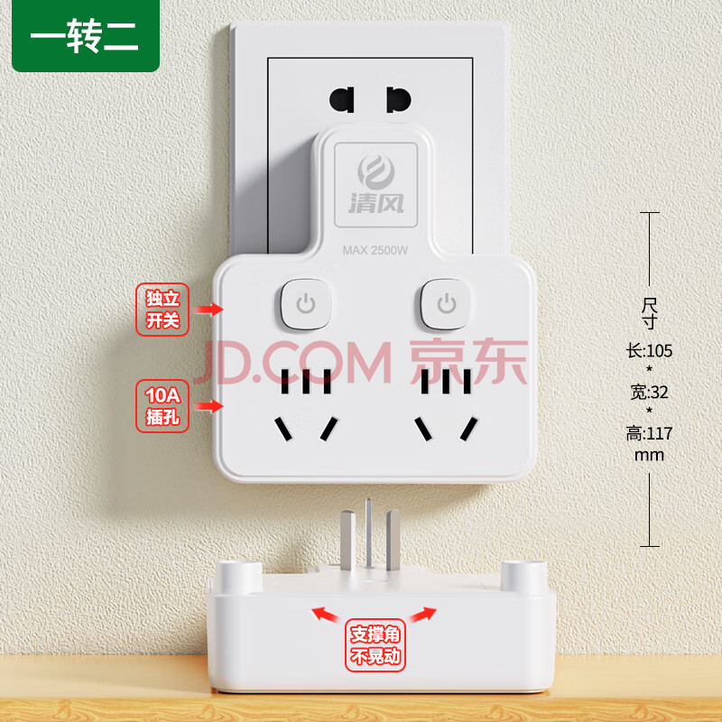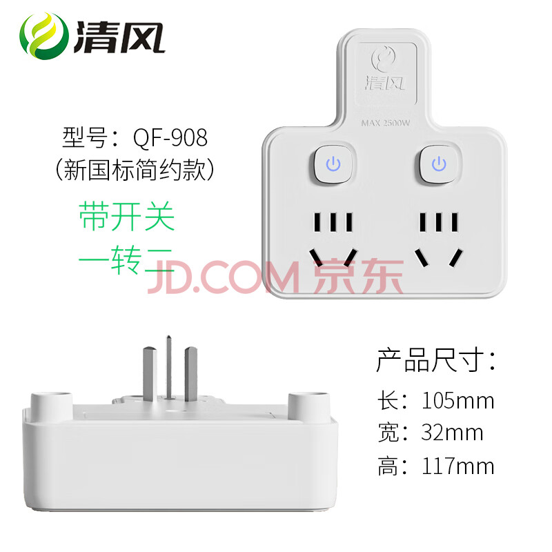 商品相册:清风(kyfen)QF-908 一转二独立开关带安全保护门电源转换器 新国标 无线白色第