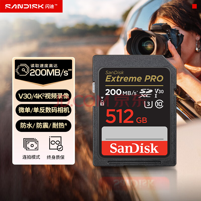 商品相册:闪迪(SanDisk)512GB SD内存卡 4K V30 U3 C10 相机存储卡 读速200MB/s 写速140MB/s 微单/单反相机内存卡第