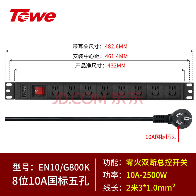 商品相册:TOWE同为PDU机柜插座8位10A机房电源插排2米线插线板接线板带双断开关EN10/G800K第