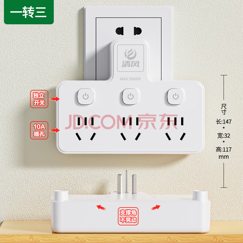 商品相册:清风(kyfen)QF-909 一转三独立开关带安全保护门电源转换器 新国标 无线白色第