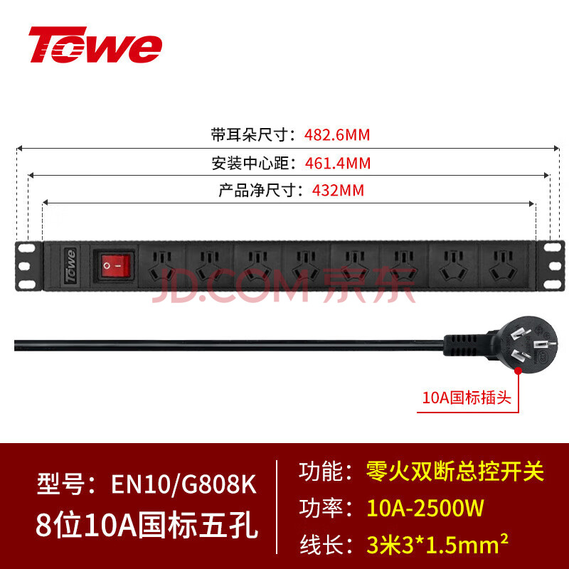 商品相册:TOWE同为PDU机柜插座8位10A机房工程拓展插排接线板3米线带总控开关EN10/G808K第