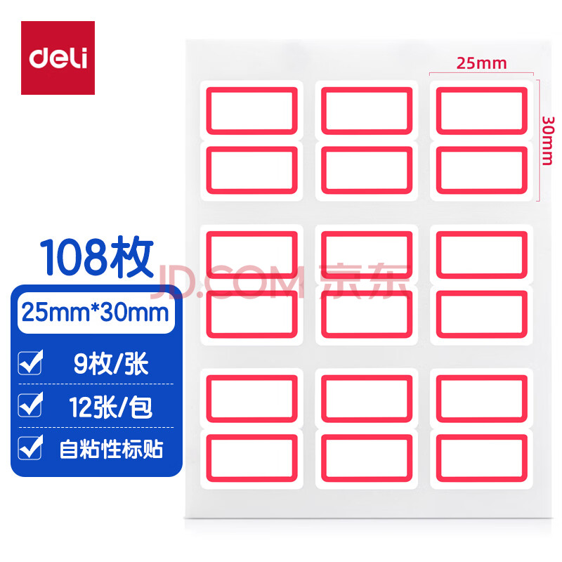 商品相册:得力(deli)108枚25×30mm红框不干胶标签贴纸便利贴自粘性标贴纸姓名贴 9枚/张 7191开学礼物第