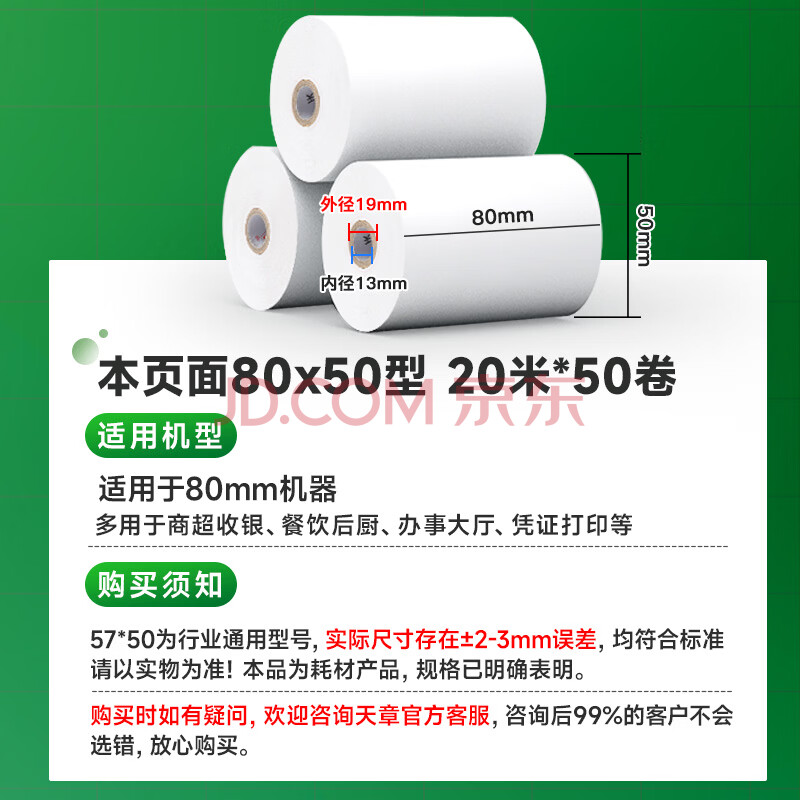 商品相册:天章 (TANGO)80*50mm20米*50卷 新绿天章 热敏收银纸京东外卖餐饮小票纸 商超收银凭证打印 适配80mm机器 P3438第