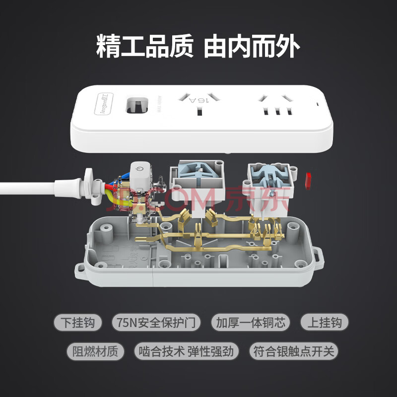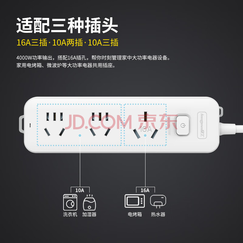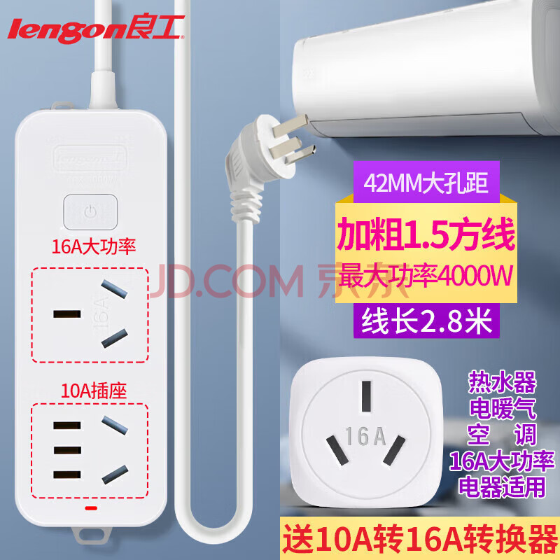 商品相册:良工(lengon)含10a转16a转换头 2插位2.8米 16A大功率空调插座4000W热水器油汀电暖器插排插线板 K102B-2.8第