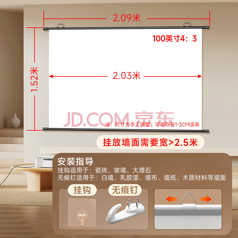 商品相册:悟印像100英寸4:3 壁挂投影幕布 高清家庭影院【适配极米坚果小米爱普生】白塑幕布 A7931第