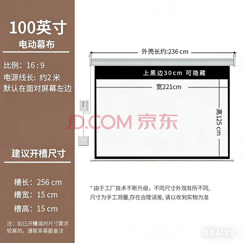 商品相册:快朵小屋100英寸16:9白玻纤电动幕布 投影仪幕布 投影机幕布 投影幕布 投影布 办公家庭 【标配遥控器】第