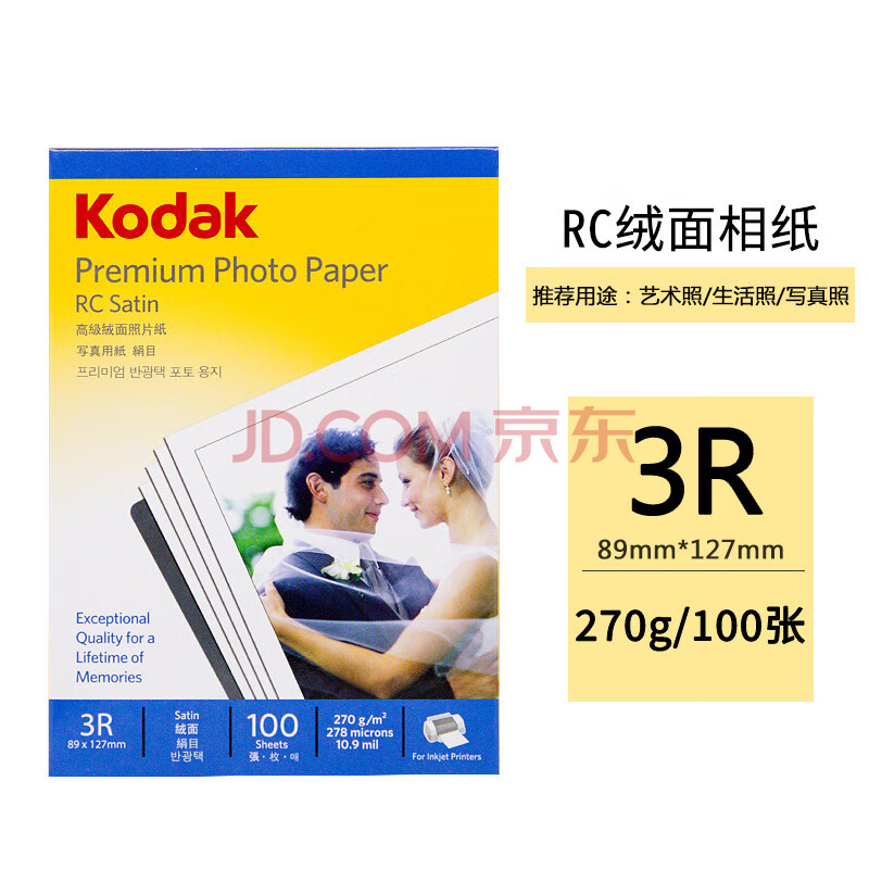 商品相册:KODAK柯达 3R/5英寸 270g绒面RC防水相纸/喷墨打印照片纸 100张装 9891-049第