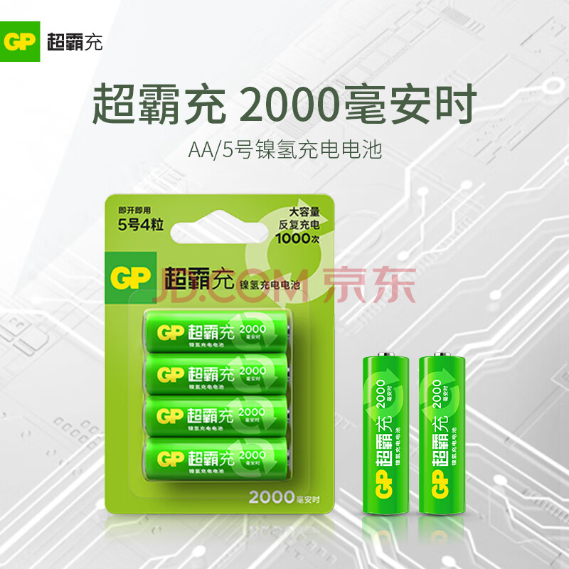 商品相册:超霸(GP)充电电池5号4粒2000mAh镍氢电池 适用于适用相机/闪光灯/游戏手柄/血压计/遥控玩具车5号/AA第