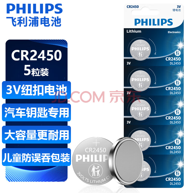 商品相册:飞利浦(PHILIPS)CR2450纽扣电池5粒3V锂电池适用沃尔沃宝马汽车钥匙遥控器电子词典主板电源手表测量仪cr2450第