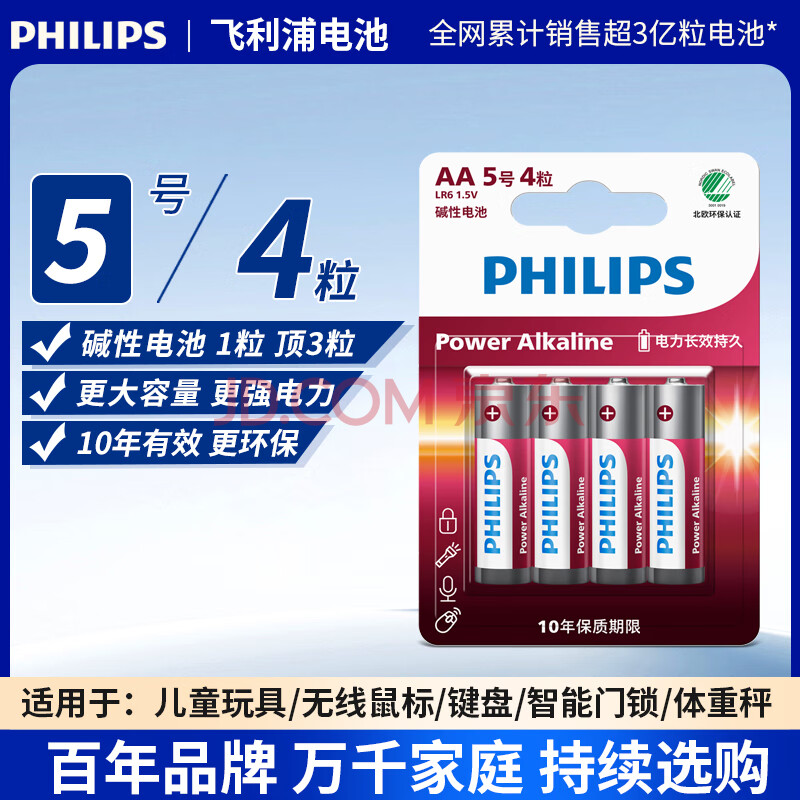 商品相册:飞利浦(PHILIPS)碱性5号电池4粒干电池 十年聚能锁电适用智能门锁/玩具鼠标/电子锁血压计/血糖仪电池5号商超同款第