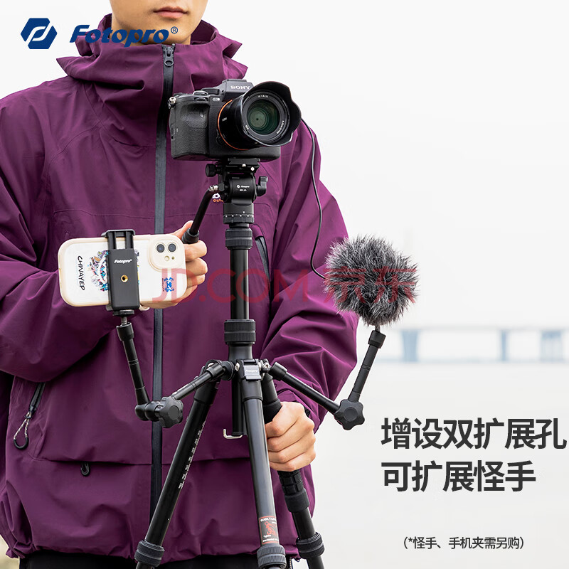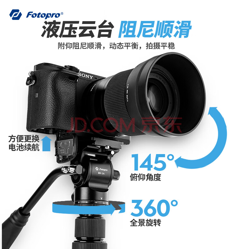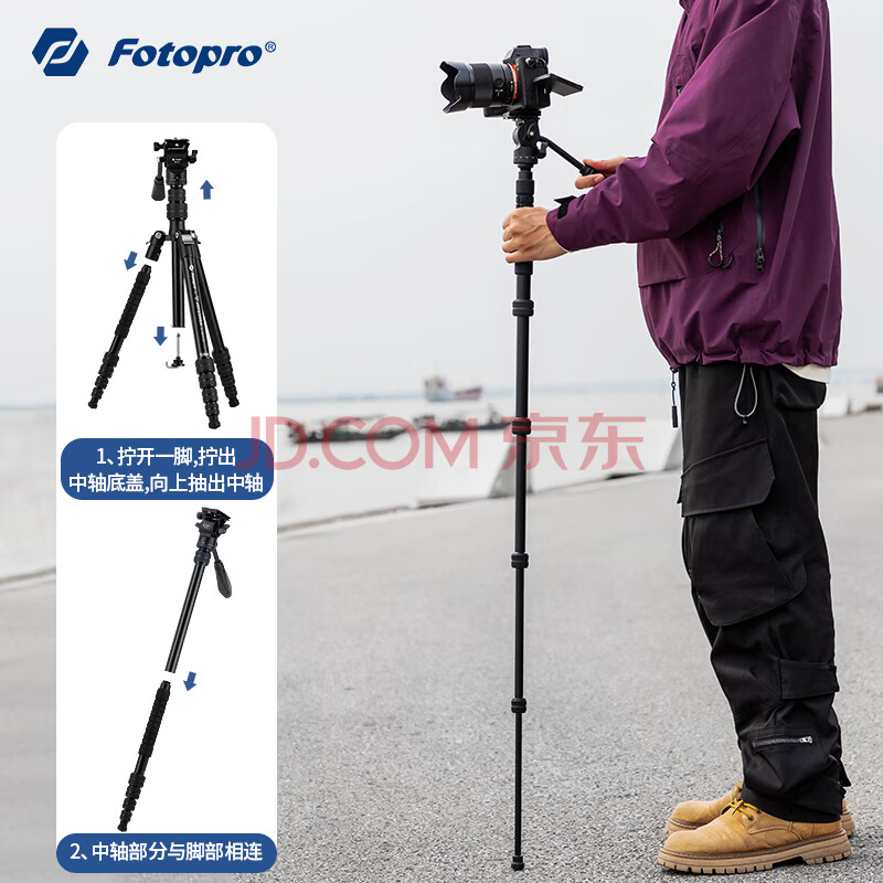 商品相册:富图宝(Fotopro)E4I PRO+MH-2A 便携反折可变独脚相机摄影液压视频云台三脚架 原碳灰第