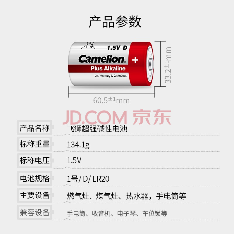 商品相册:飞狮(Camelion)碱性电池 干电池 LR20/D/大号/1号 电池 2节 燃气灶/热水器/收音机/手电筒/电子琴第