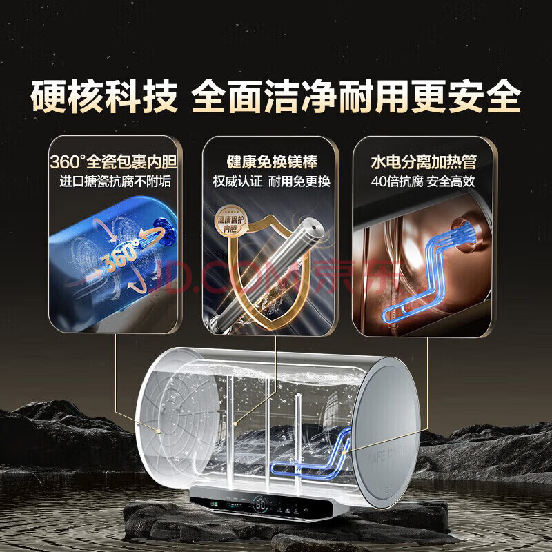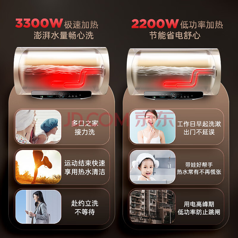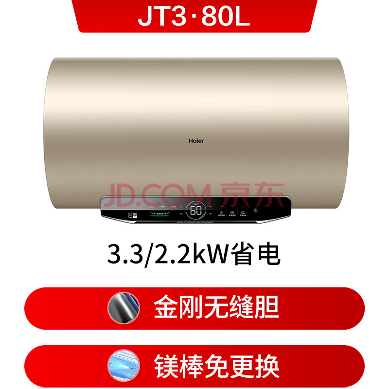商品相册:海尔电热水器80升 JT3 金刚无缝胆 3300W变频节能速热 终身免换镁棒 一级能效家用储水式第