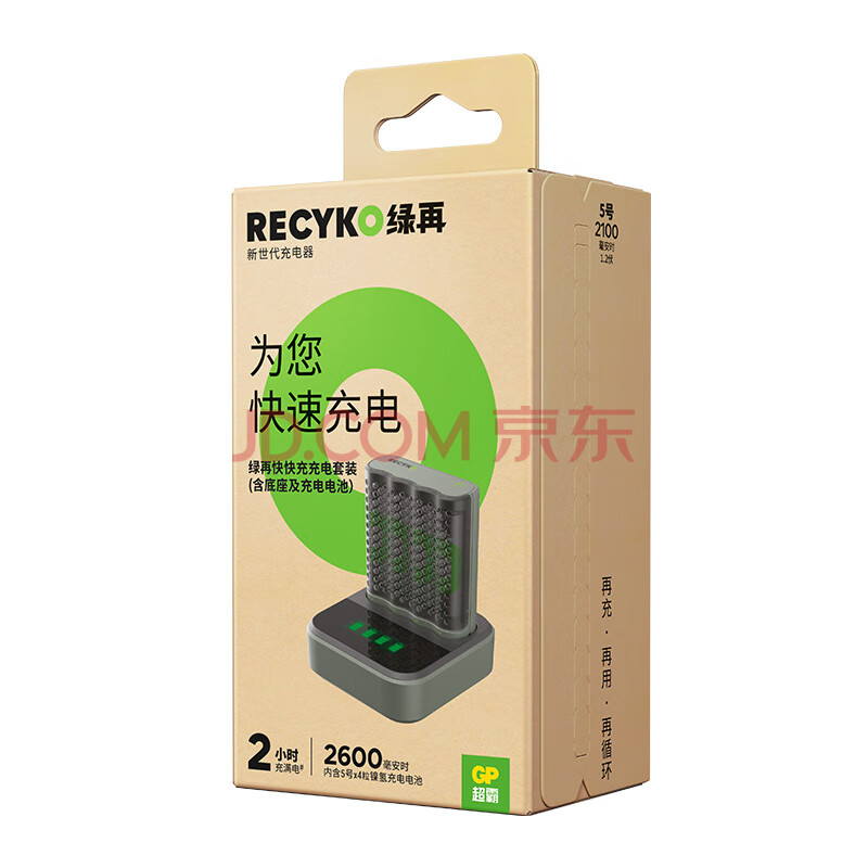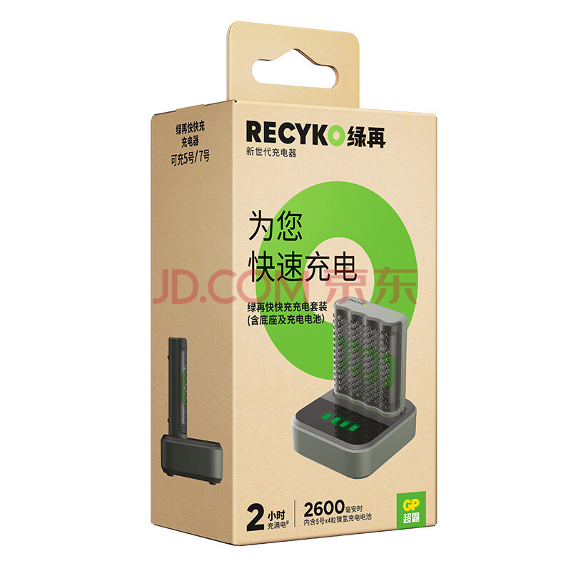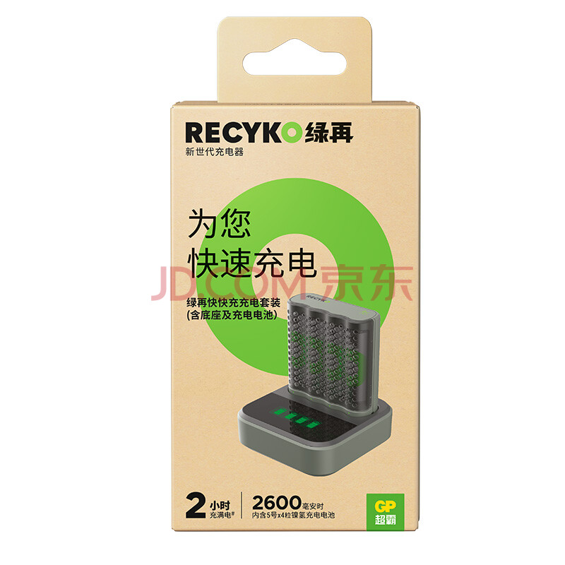 商品相册:超霸(GP)Recyko绿再5号充电电池4粒2600mAh+充电器套装可充5号7号电池4槽快充(M451+D451)适用于相机/玩具第