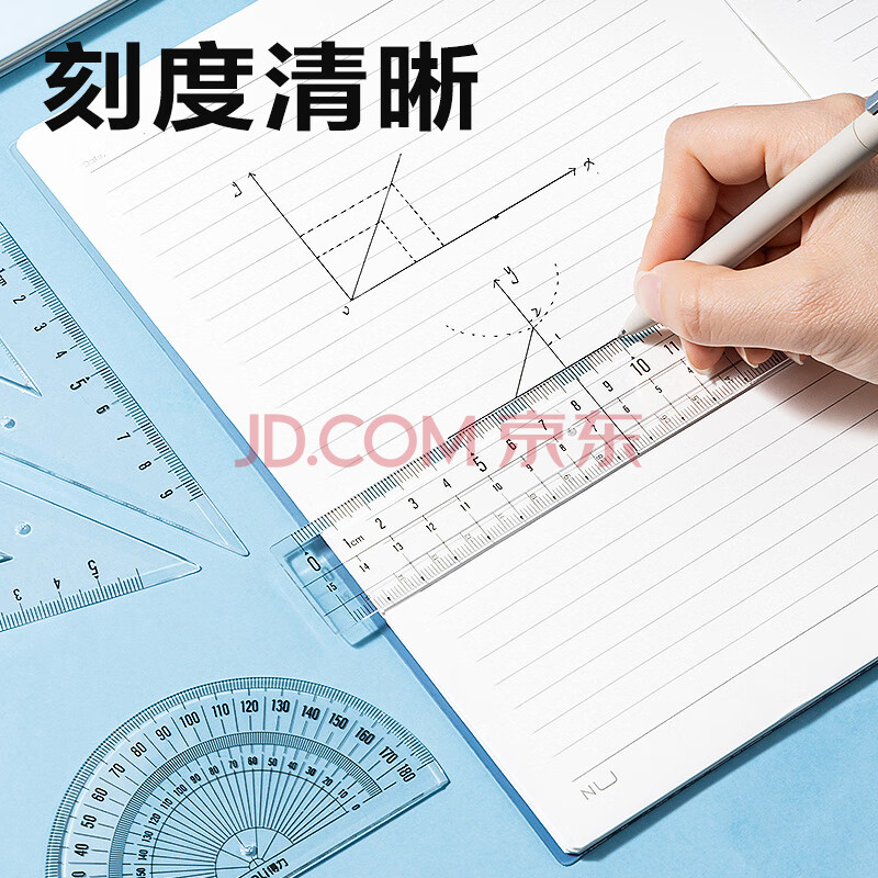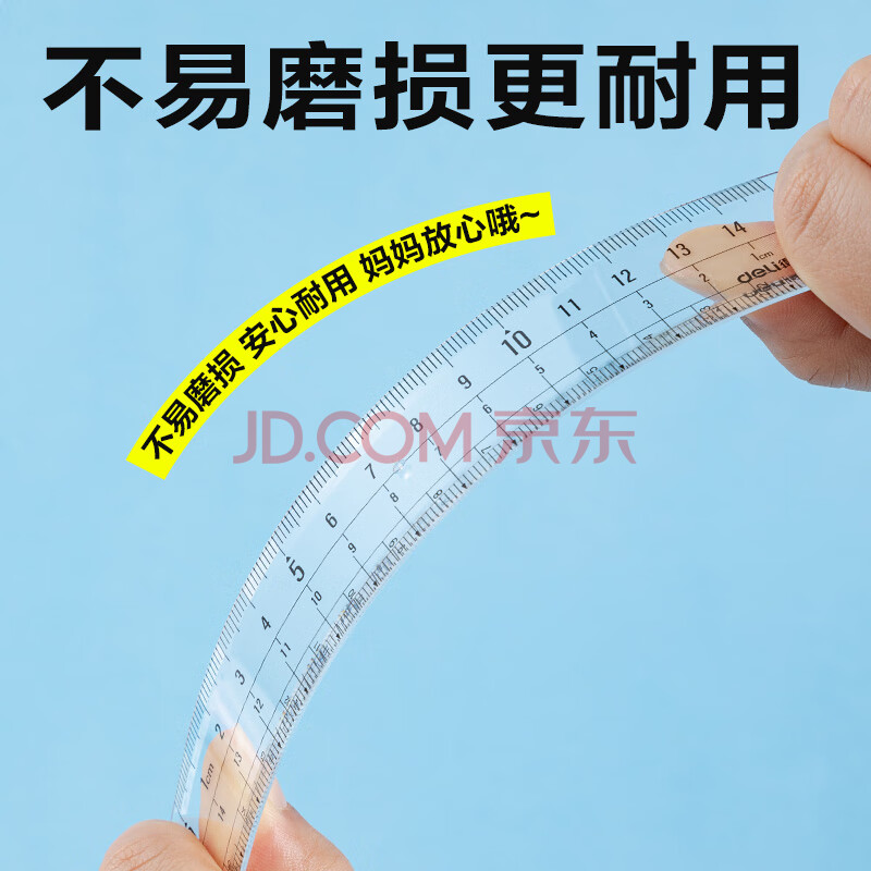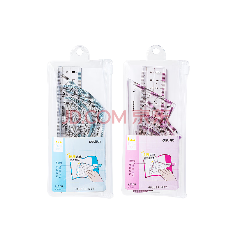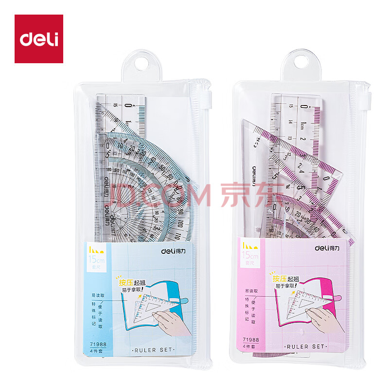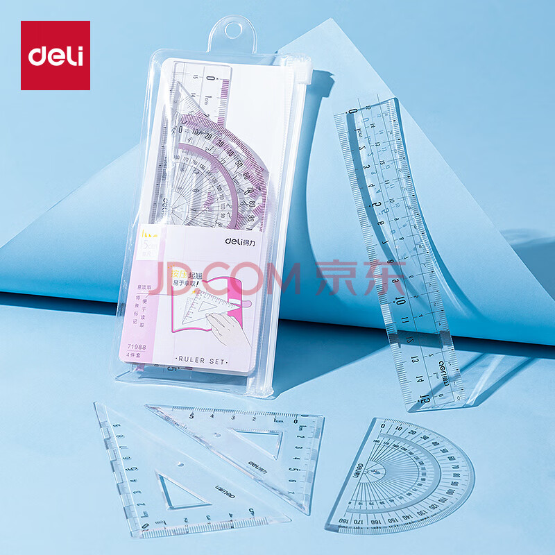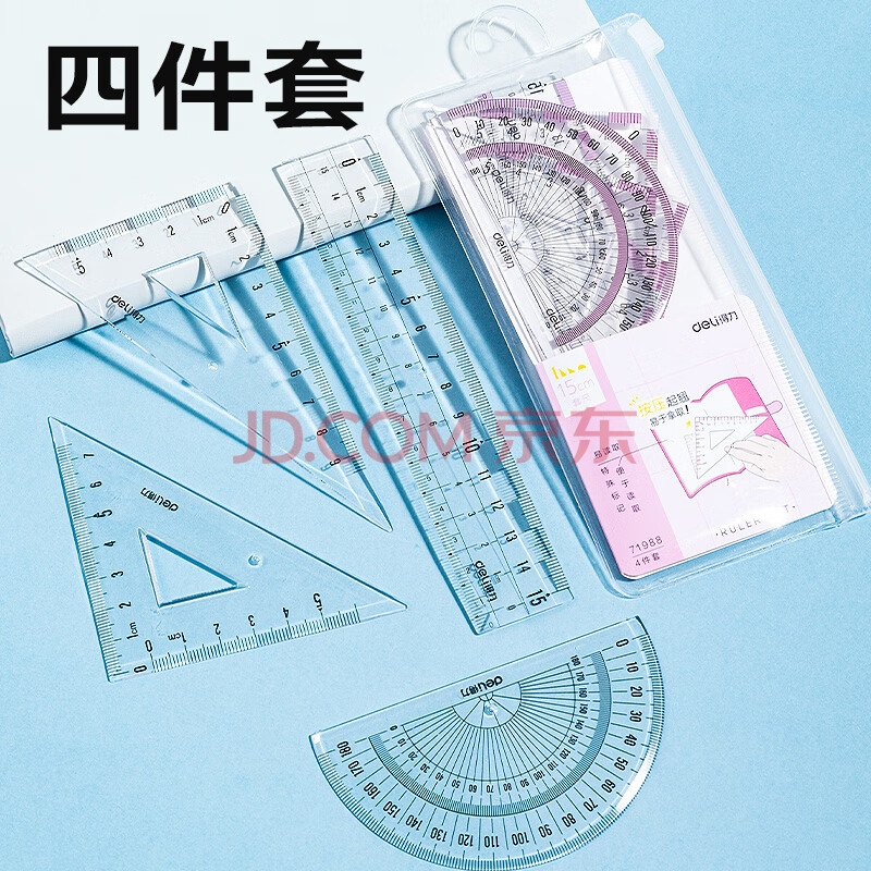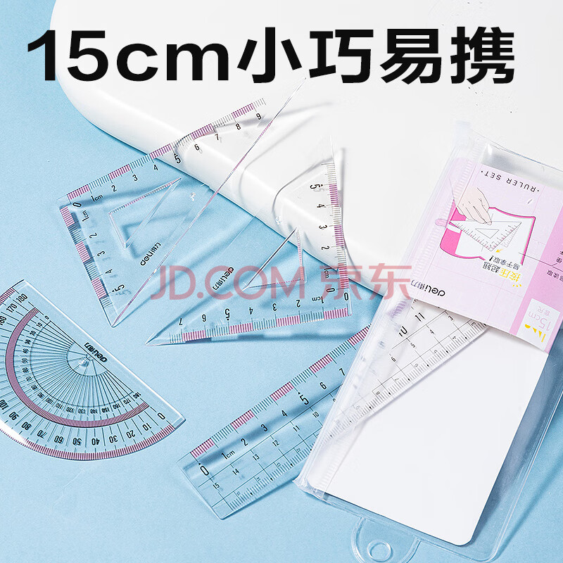 商品相册:得力(deli)15cm高透系列高考中考学生直尺三角尺量角器绘图组合套尺4件套开学必备文具第1张/共8