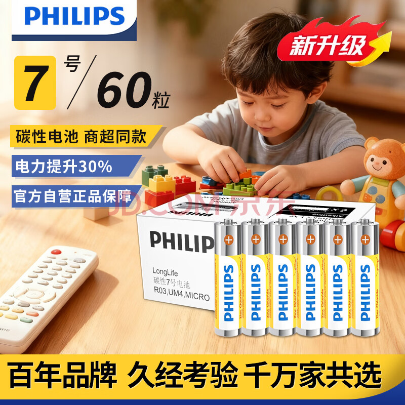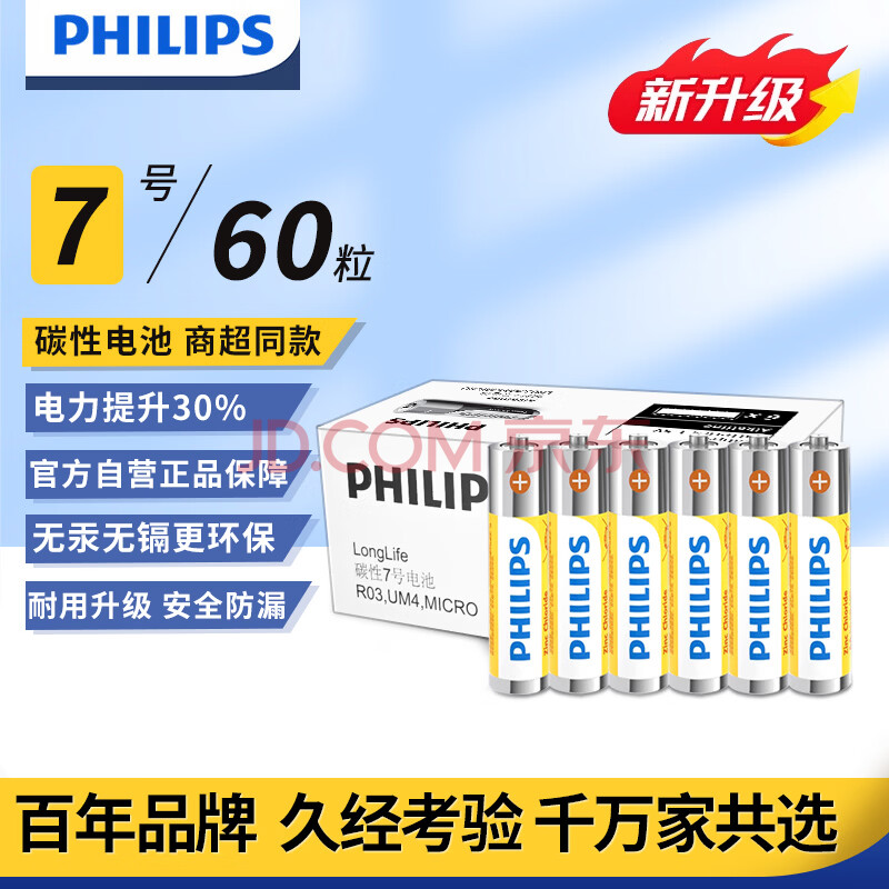 商品相册:飞利浦(PHILIPS)碳性7号电池60粒黄色干电池适用遥控器/钟表/电子称/血氧仪/血压计/血糖仪/耳温枪电池7号 AAA第