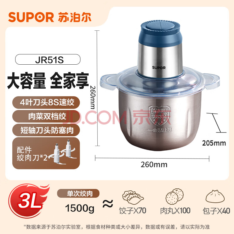 商品相册:苏泊尔(SUPOR)绞肉机 家用多功能搅拌机不锈钢料理机3L大容量秒速绞馅婴儿辅食机绞馅机 JR51S第