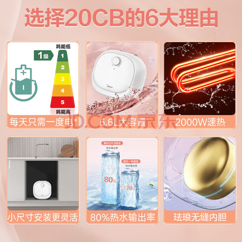 商品相册:美的(Midea)【8年质保】电热水器小厨宝6.6L出水36L一级能效洗碗洗菜热水器厨房热水宝F6.6-20CB(ES)第