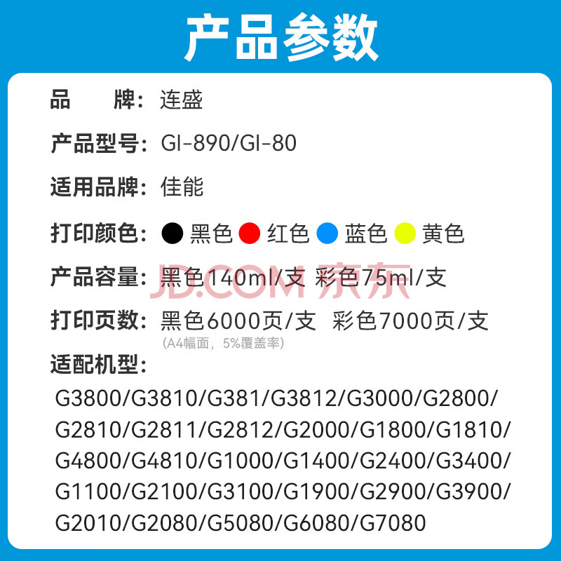 商品相册:连盛适用佳能G3800 G2810 G1810 G3810 G2800 G3000 G3812 G4810 2010 canon打印机墨水 GI-890/80四色第
