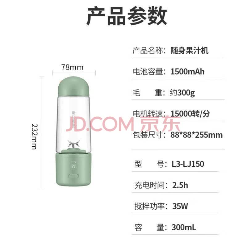商品相册:九阳(Joyoung)榨汁机便携式网红充电迷你无线果汁机料理机随行杯【全身水洗 无线便携】 L3-LJ150(绿)第